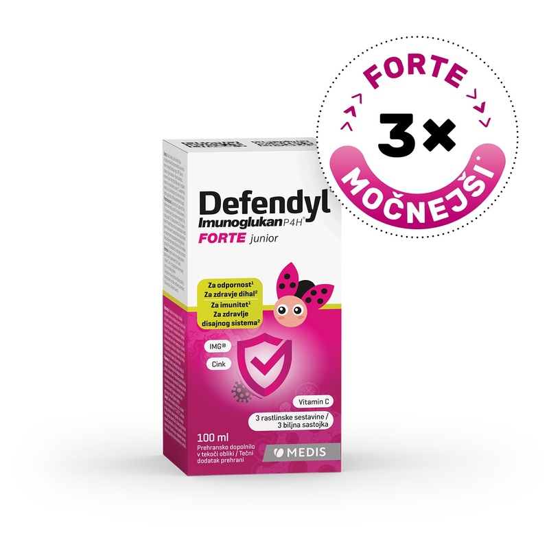 Defendyl-Imunoglukan P4H® FORTE junior je okusno prehransko dopolnilo za zdravje dihal1 in imunskega sistema1, ob prvih znakih slabega počutja2. Edinstvena kombinacija bukovega ostrigarja IMG®, vitamina C, cinka in rastlinskih izvlečkov s pozitivnim vplivom na imunski sistem in zdravje dihal1.